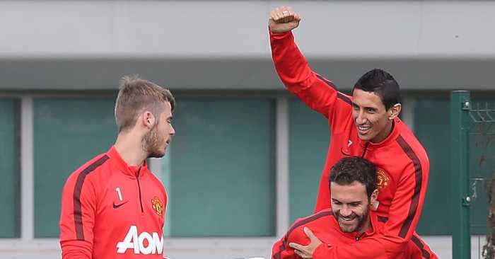 Angel Di Maria Gets A Piggyback From Juan Mata And David De Gea As